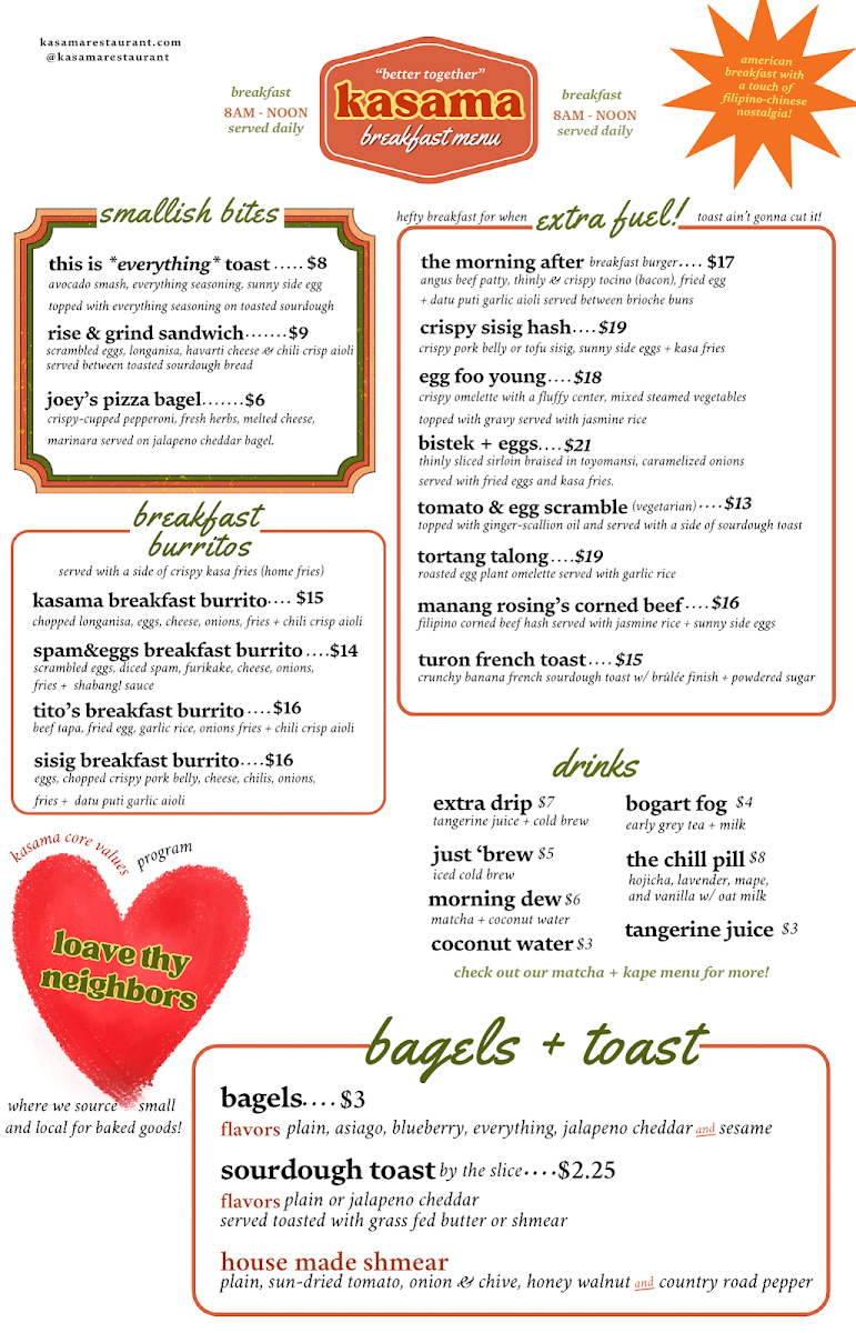 Kasama’s menu suits a welcoming spot where guests can enjoy familiar tastes with a twist, whether dining solo or sharing with friends and family. The approachable dishes and comfortable surroundings support a calm, enjoyable experience throughout the day.