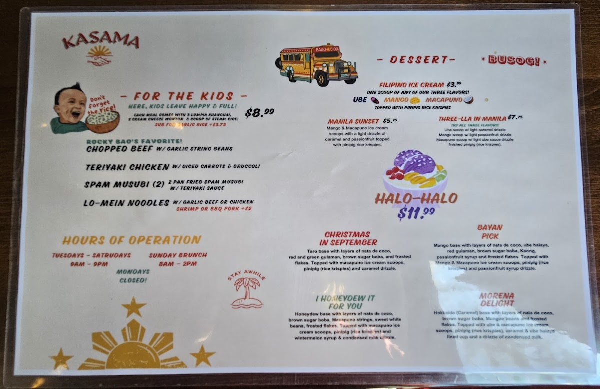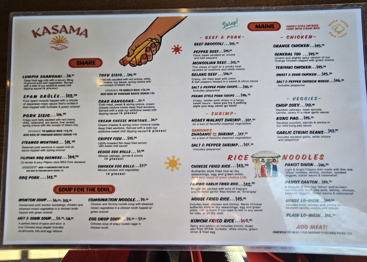 Kasama Restaurant offers a menu that blends the comforting flavors of Filipino cuisine with Southeast Asian and Chinese influences, all served in a warm and inviting setting. Whether you're stopping by for a casual breakfast or settling in for a family-style dinner, the selection is designed for everyday enjoyment with familiar yet thoughtfully crafted dishes.
